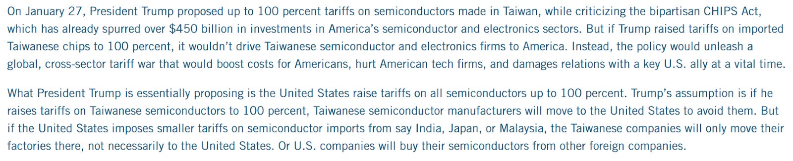 Geopolitical Impact: Proposed 100% chip tariffs could disrupt supply chains, forcing manufacturing shifts.