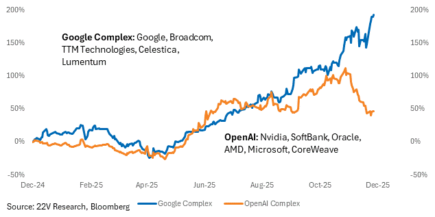 Since the start of Q4 2025, Google-linked equities have massively outperformed OpenAI-linked names, as shown below.
