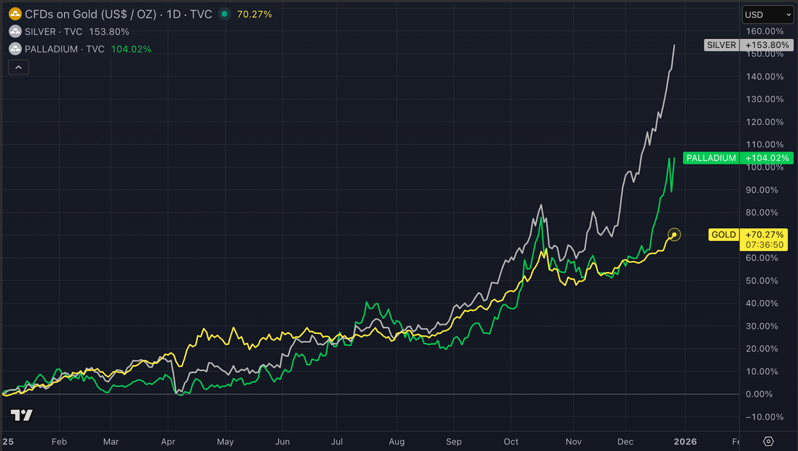 Gold and silver are at ATHs, while palladium continues to lag—still below 2020 levels despite a +100% YTD breakout.