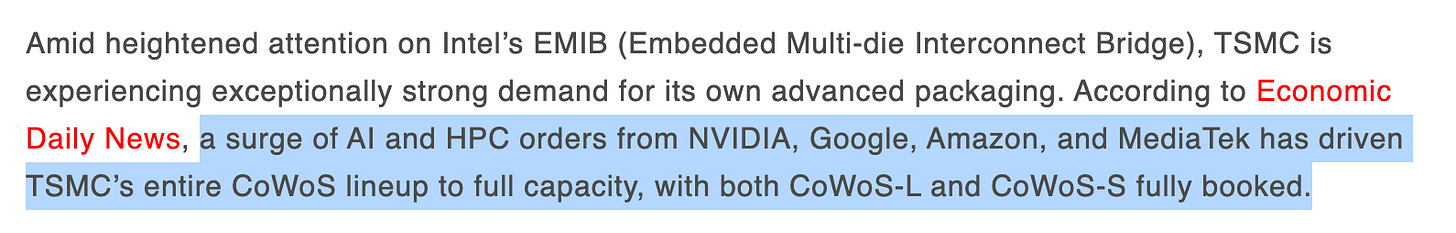 TSMC’s CoWoS capacity is fully booked through 2026, capping supply just as AI compute demand continues to compound.