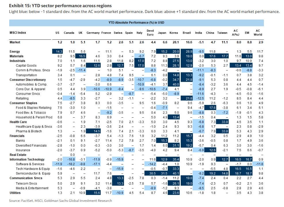 YTD leaders include South Korea — powered by semiconductor and memory strength — and Brazil, led by energy and base metals.