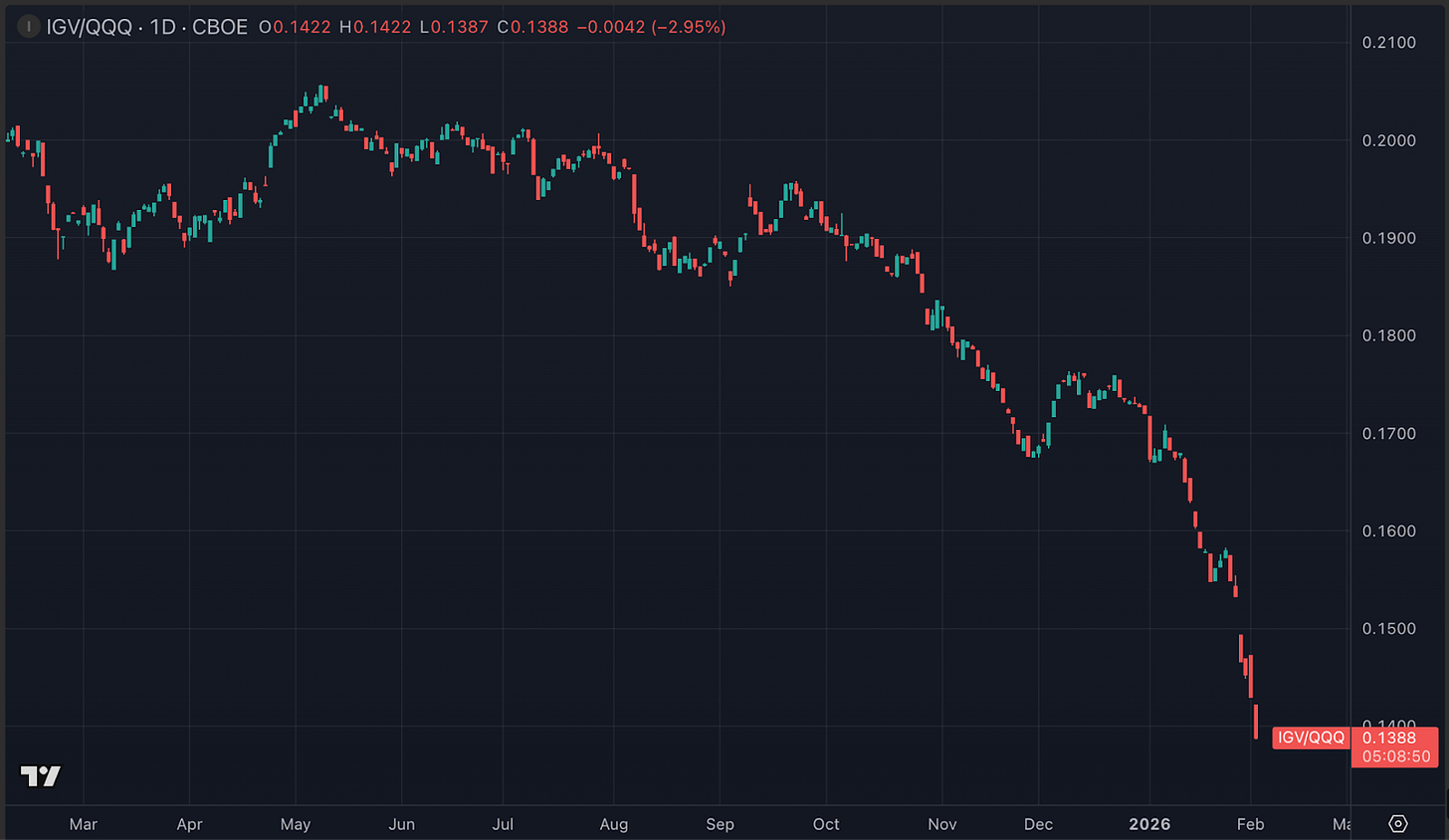 Software isn’t collapsing — it’s undergoing a forced repricing. IGV is down 17% YTD vs QQQ as AI disruption drives a heavy rotation.